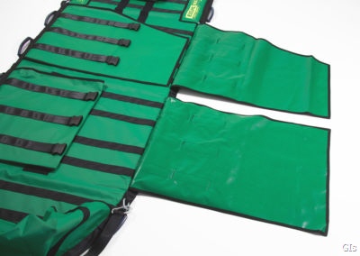 - Diese Evakuierungsmatratze muss von mehreren Pflegekräften oder Evakuierungshelfern betrieben werden und ist als Schleifmatratze zu nutzen (Bedienung erfolgt durch mehrere Helfer mittels der Zugbänder) und ist an den Längsseiten mit 12 Tragegriffen ausgestattet.