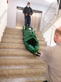 - Mit einer Evakuierungsmatratze Escape-Mattress® kann eine hilfsbedürftige Person in liegender Position über Treppen und Flure in Sicherheit gebracht werden.